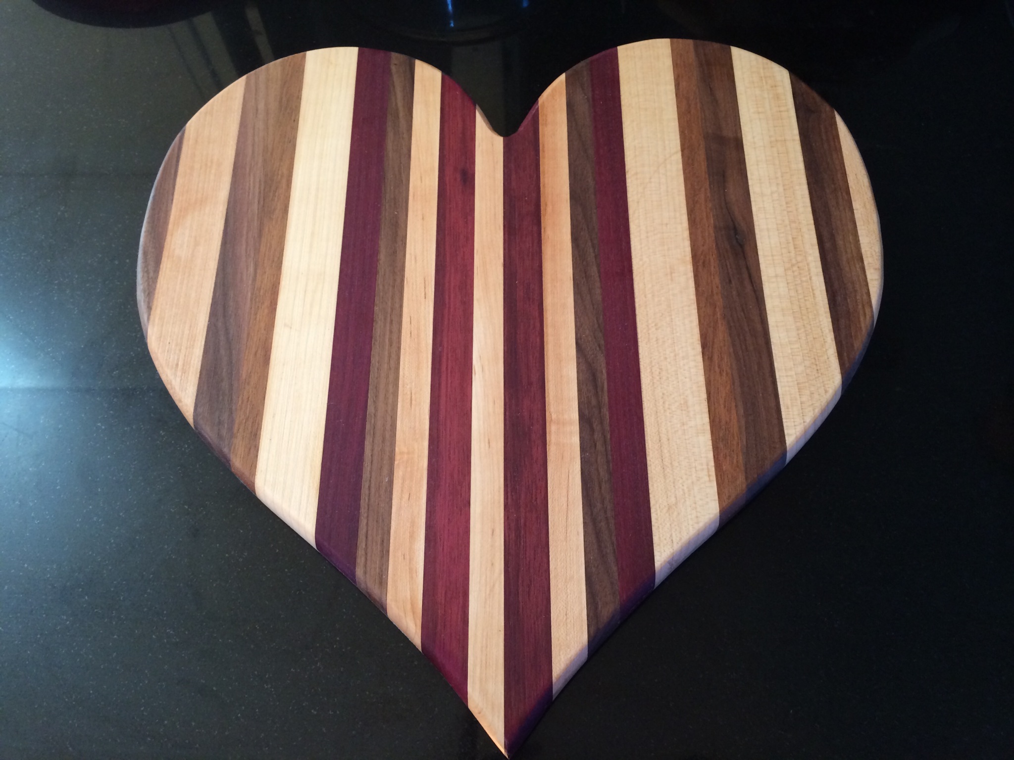 A heart shape cutting board made from unused scrap hardwoods. This cutting board is a perfect gift to give to your love one for any special occasion such as Valentine's Day, Mother's Day, Wedding Day, Anniversary, Birthdays, Graduation Day ... really any great occasion you want to celebrate. Personalize it by custom engraving this heart shape cutting board with their name or saying that is unique to you and the recipient.