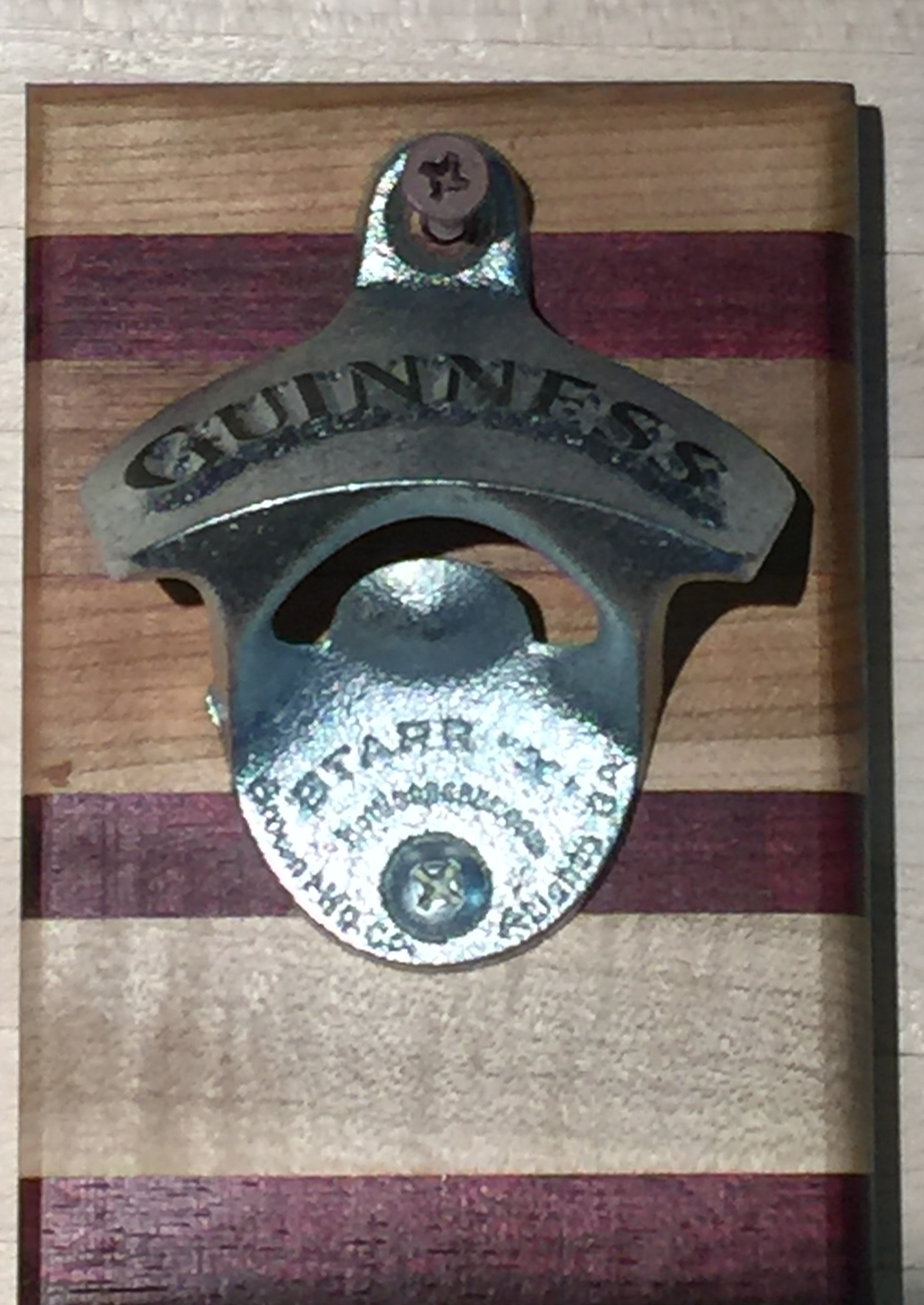 WALL Mounted Bottle Opener with all necessary mounting screws included. The wooden surface is customed designed by Mac Cutting Boards made from repurposing and upcycling scrap hardwoods to bring you the unique design - one of a kind. The wall mounted bottle opener can be mounted on a concrete surface with ease, outdoors and indoors. Perfect for any man cave decor!